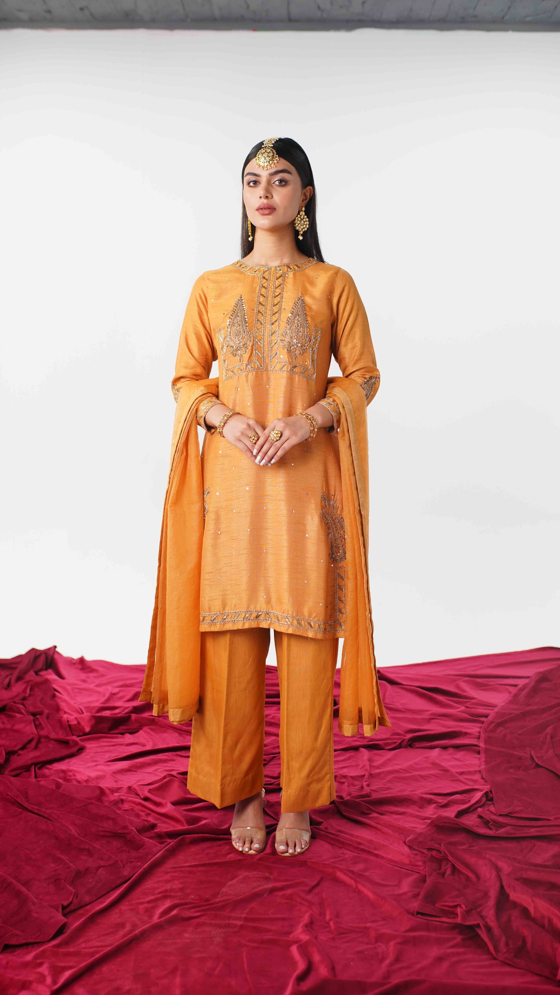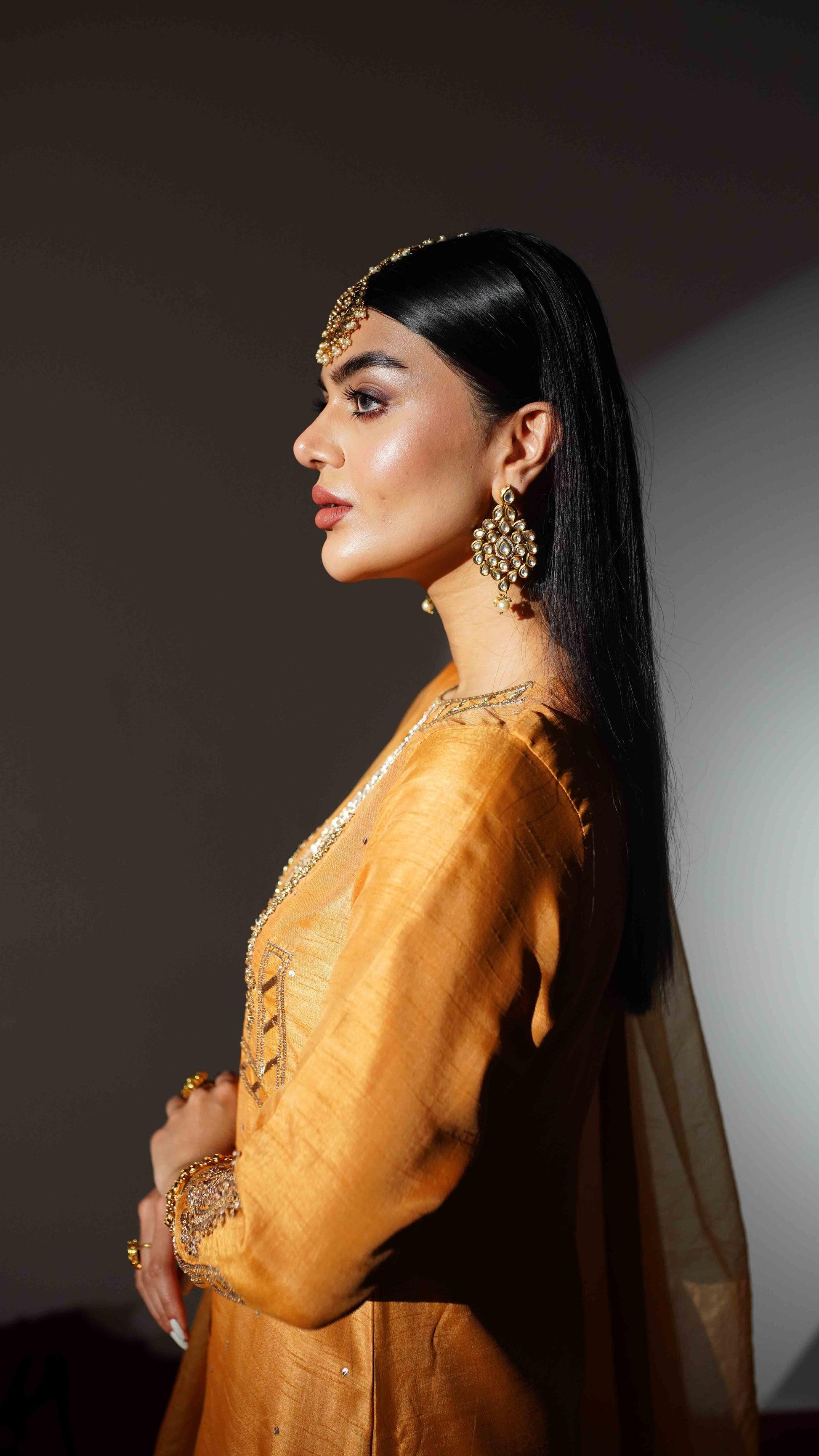 The Sunehri dress features rich Korean Silk fabric for both the shirt and trouser, paired with a delicate Organza Dupatta, offering a perfect blend of sophistication and opulence. Each element of the ensemble showcases meticulous handwork and exquisite detailing.