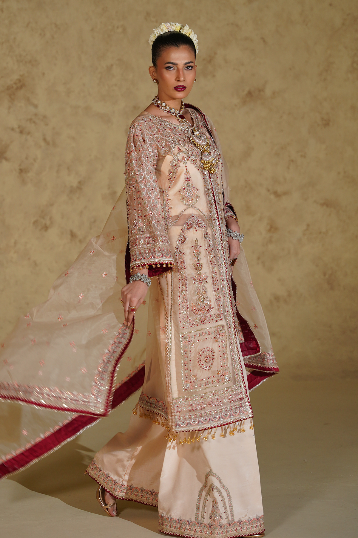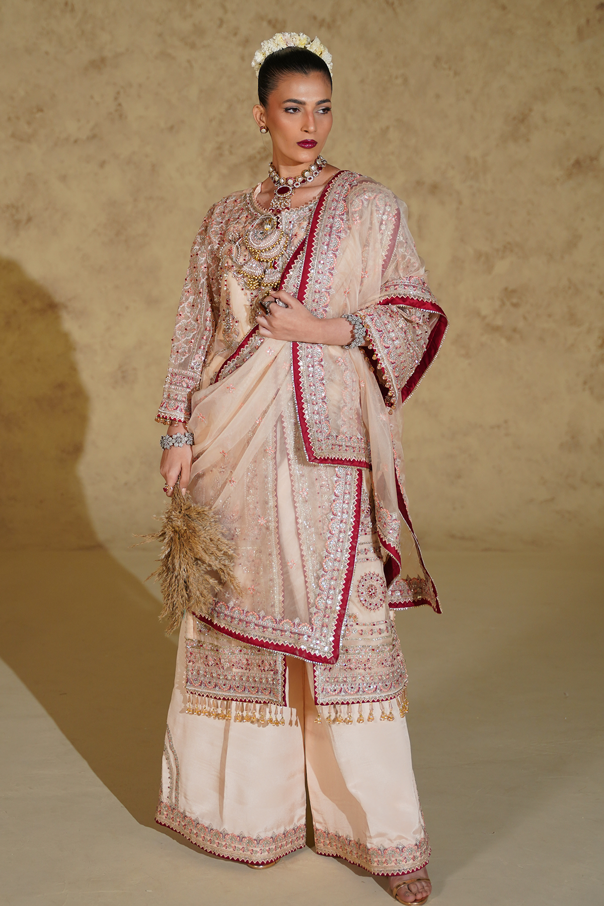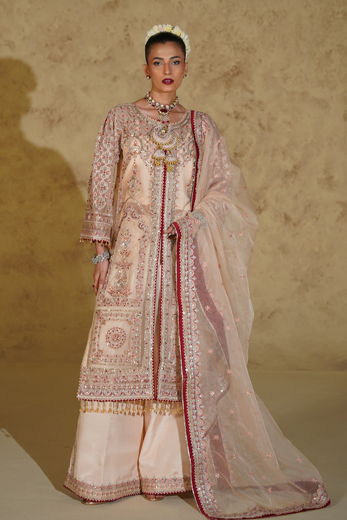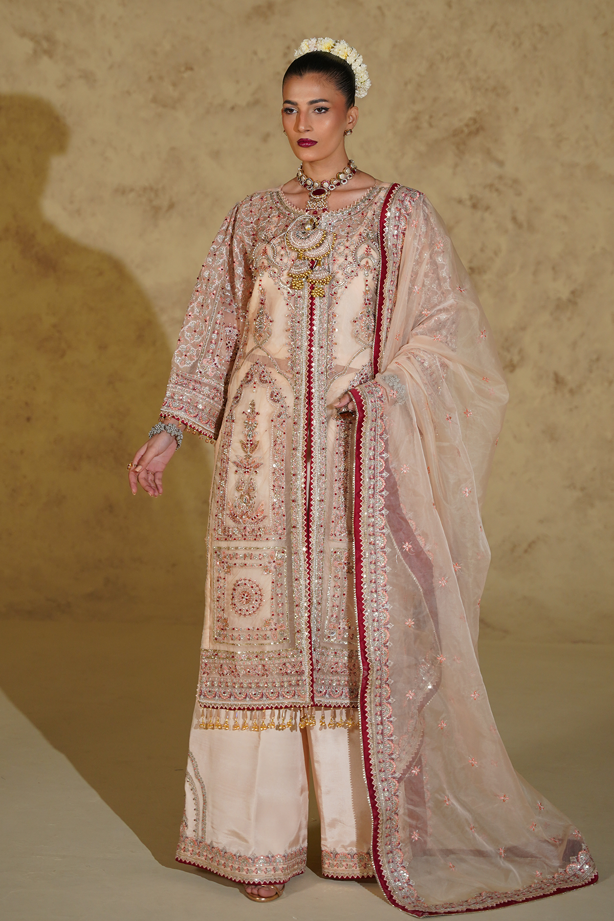 This elegant ensemble is crafted from sheer organza and enhanced with intricate hand embellishments, offering a refined and graceful appeal. The embroidered and embellished panels, sleeves, and back spray are finished with delicate borders, creating a balanced and sophisticated silhouette. Paired with a beautifully embroidered organza dupatta featuring four-sided borders, the look is completed with a soft cotton inner and luxurious raw silk trouser fabric. Designed for formal and festive occasions, this outfit embodies timeless craftsmanship and understated luxury.