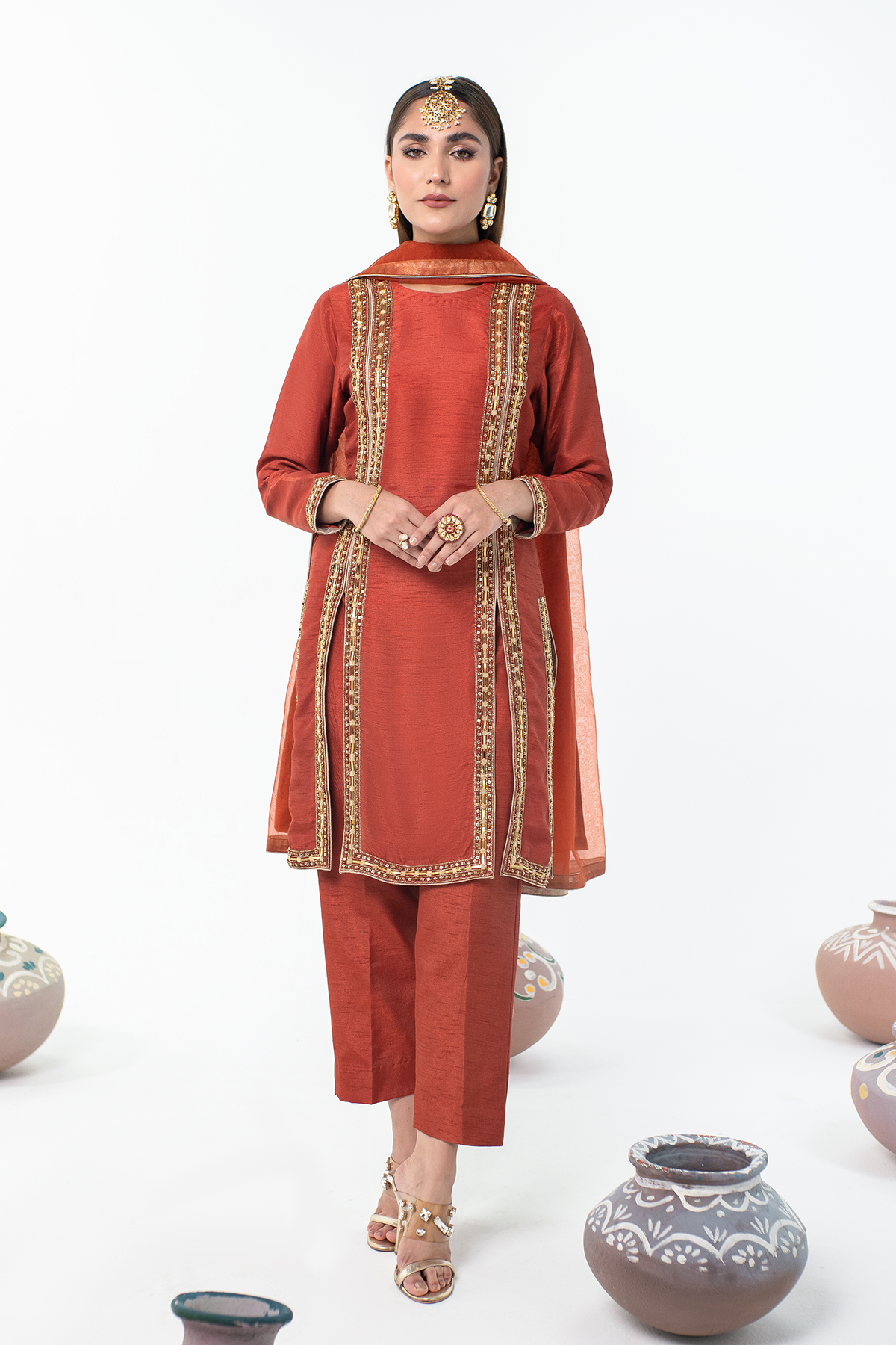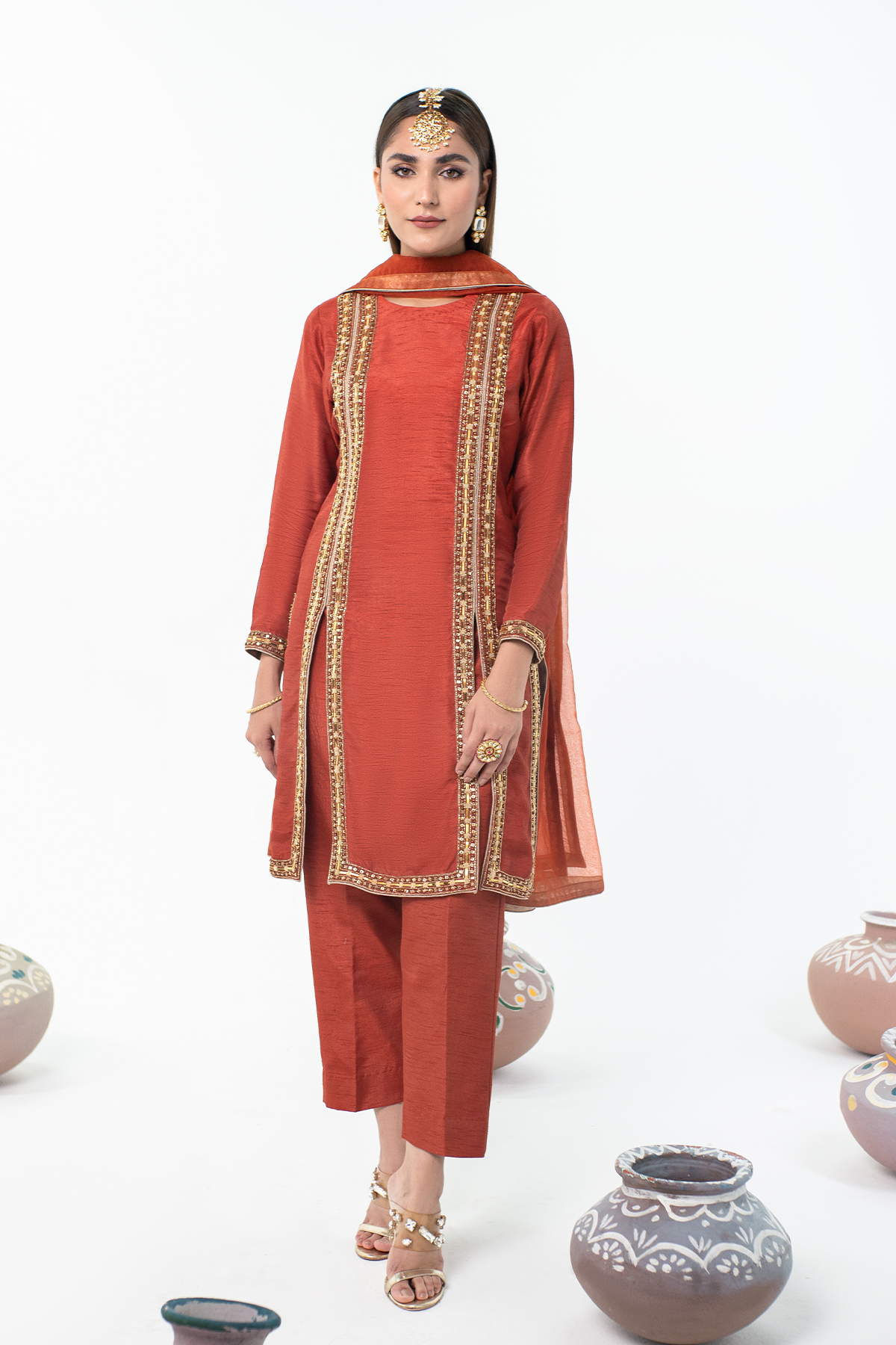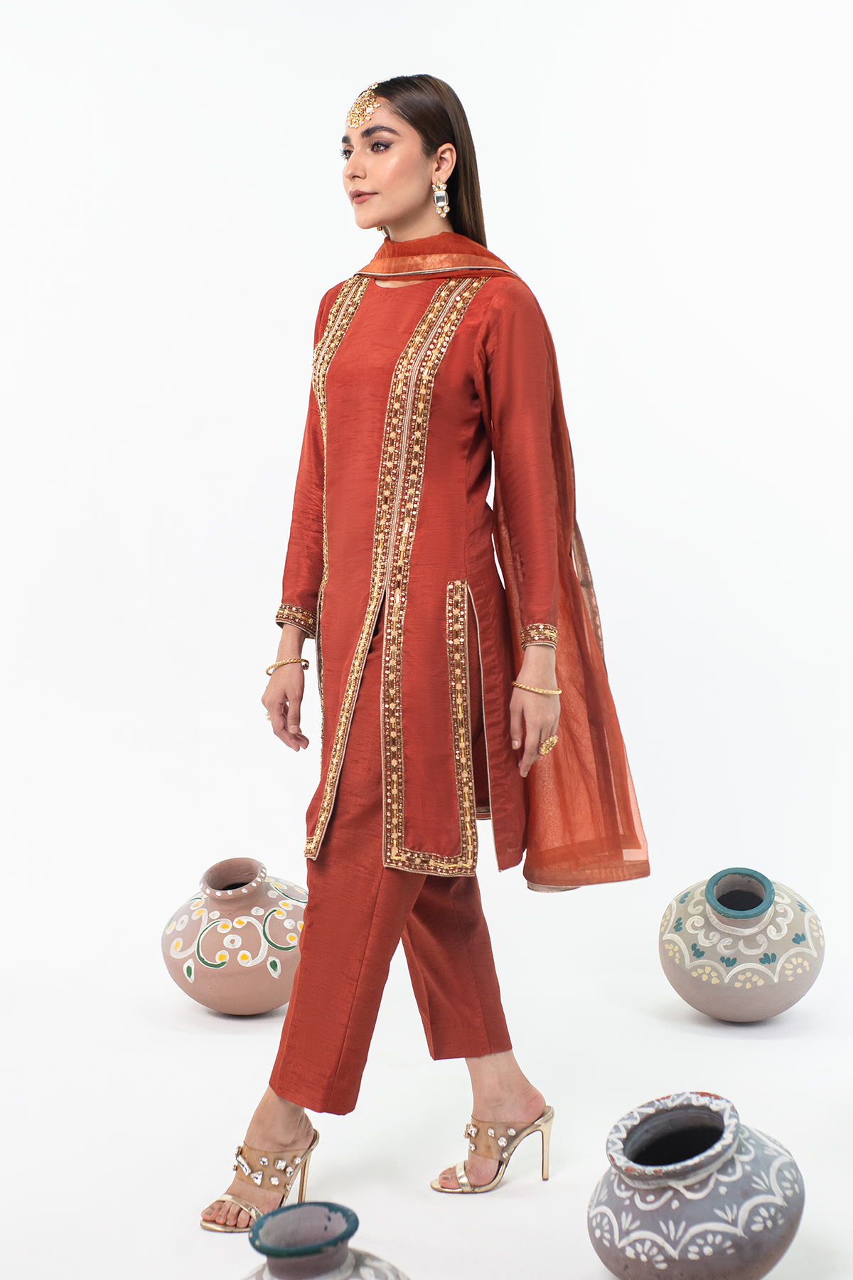 Dabka: Metallic thread embroidery adds a glamorous, golden sheen.
