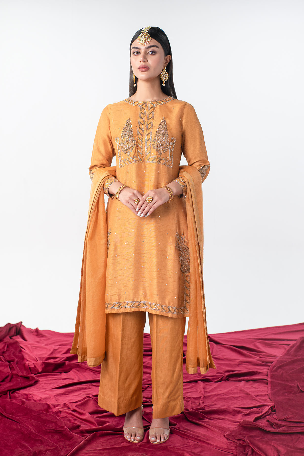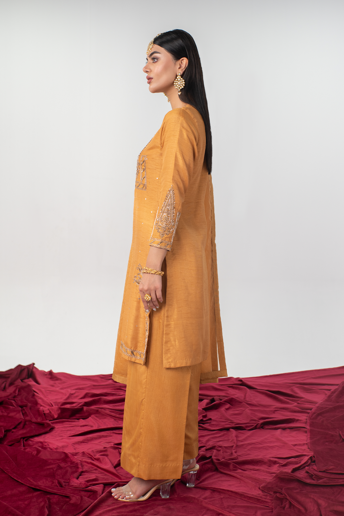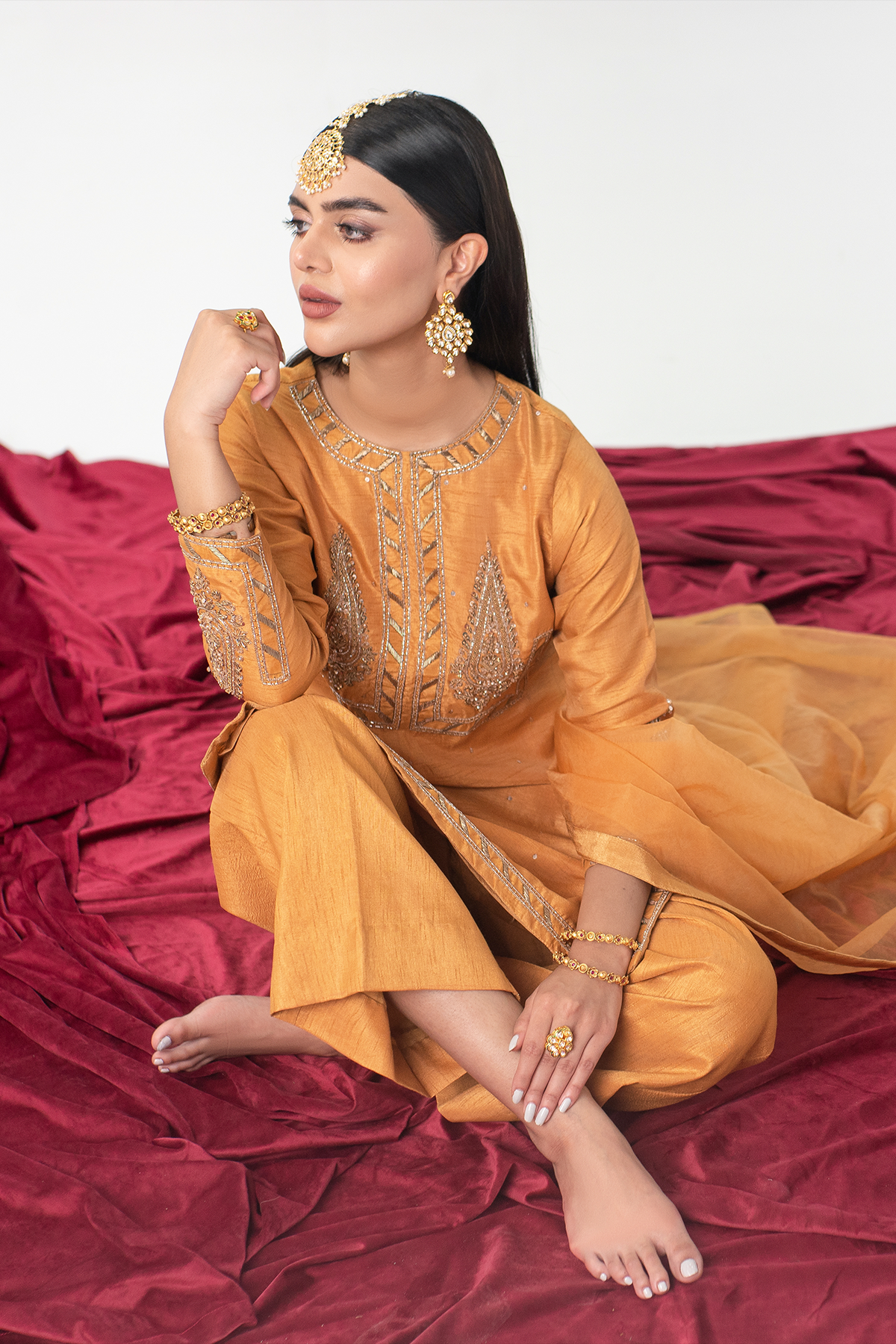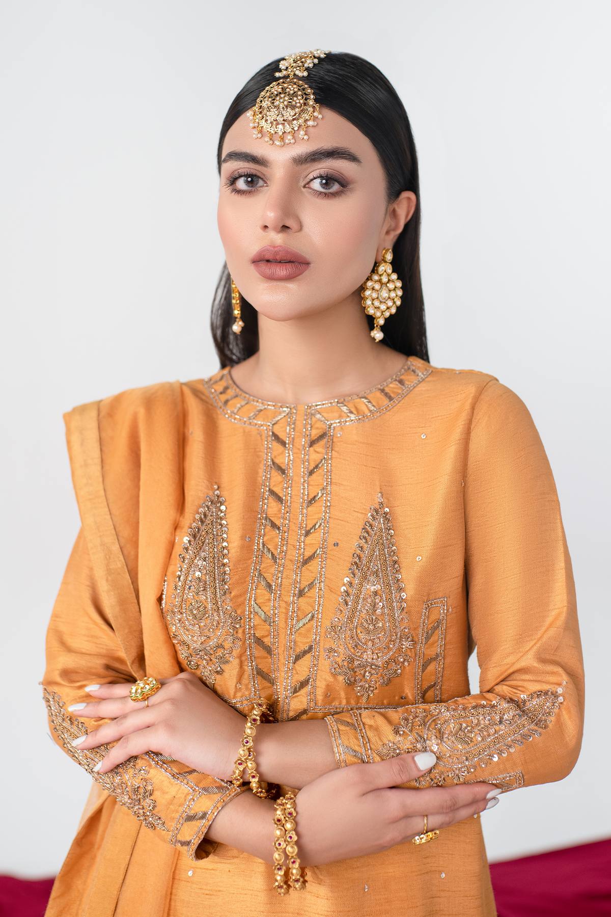 Sunehri is the epitome of luxury, fashion, and timeless elegance. This stunning golden-yellow dress is crafted from premium silk and adorned with intricate Persian-inspired motifs, making it a radiant masterpiece for high-end occasions. Every element reflects meticulous handwork—each detail carefully created to make you shine like royalty.